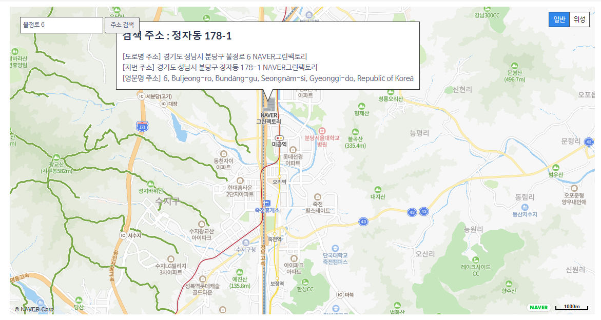 페이지 화면이 로딩되면 searchAddressToCoordinate('정자동 178-1'); 주소 검색값으로 해당 위치로 이동해 준다.