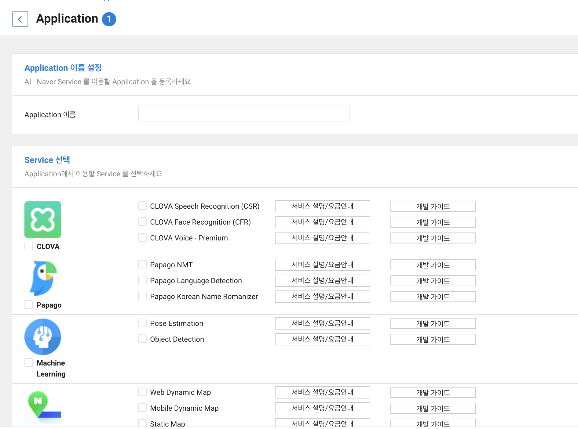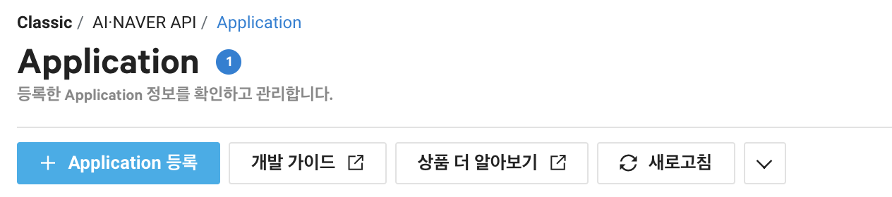 AI-NAVER API 탭에 들어가면 다음과 같은 화면을 볼 수 있다