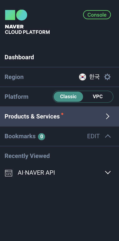 콘솔의 왼쪽 사이드 바에보면 Products & Services 메뉴가 있다
