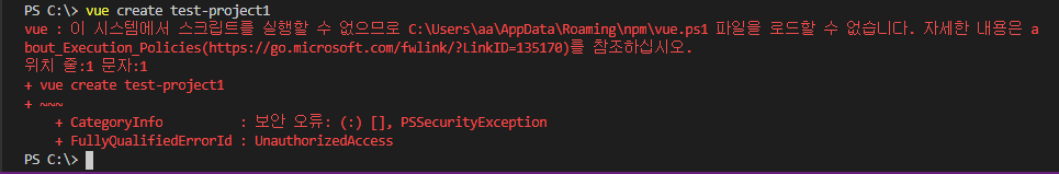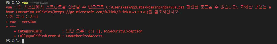 vue : 이 시스템에서 스크립트를 실행할 수 없으므로 C:\Users\aa\AppData\Roaming\npm\vue.ps1 파일을 로드할 수 없습니다. 자세한 내용은 about_Execution_Policies(https://go.microsoft.com/fwlink/?LinkID=135170)를 참조하십시오.