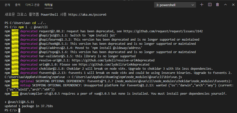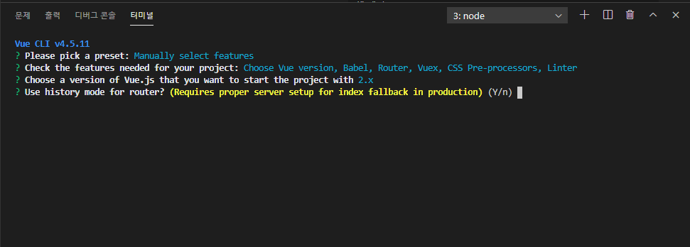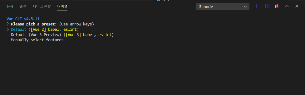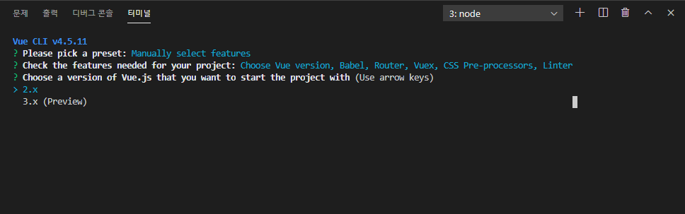 라고 노출이 됩니다. 이게 뭔가 하며 엄청 찾고 찾고.. 어디서는 터미널을 cmd로 변경해라 등등 많은 글을 읽었다가 찾다보니 뒤늦게 알게 된 사실은 설치 이미지에 보이는 vue cli 버전 4.5.11 언제 버전 부터인지 모르겠지만