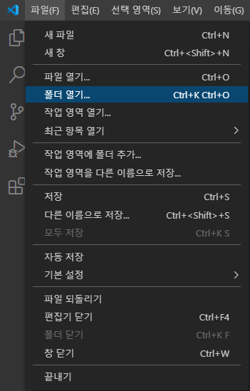파일 > 폴더 열기 선택해서 생성된 프로젝트 폴더를 열면 끝입니다.