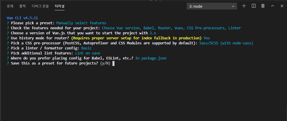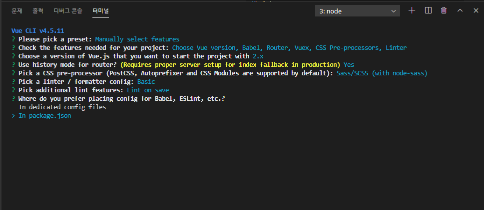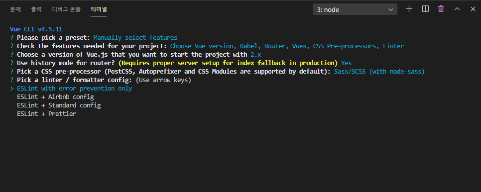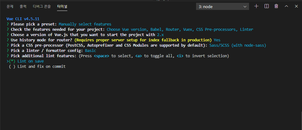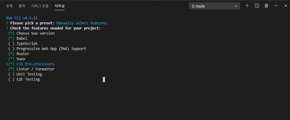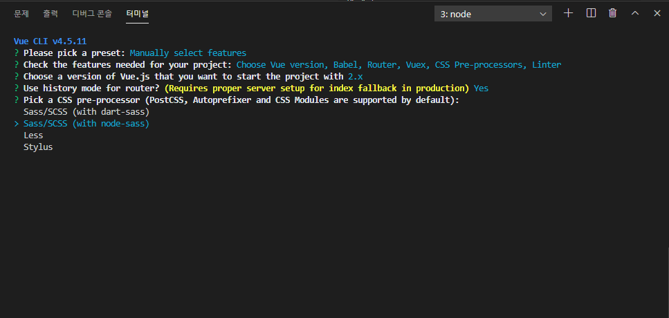 전 여기서 Router / Vuex / CSS Pre-processors 를 추가 선택하였습니다.