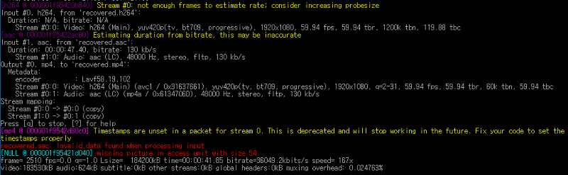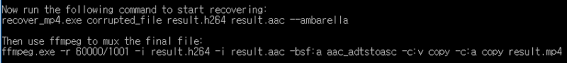 명령어 : ffmpeg.exe -r 60000/1001(프레임수) -i recovered.h264 -i recovered.aac -bsf:a aac_adtstoasc -c:v copy -c:a copy recovered.mp4