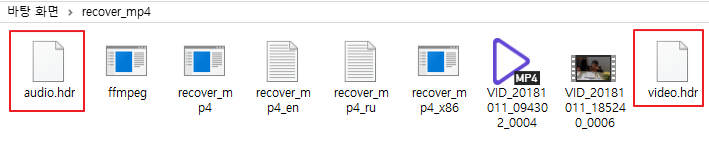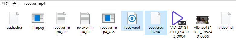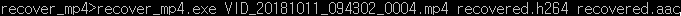 명령어 : recover_mp4.exe ~~_0004.mp4(손상된 파일) recovered.h264 recovered.aac
