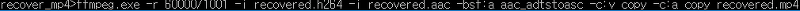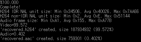 결과물 : CMD창에 아래와 같은 메세지가 뜨면서 recovered.h264와 recovered.aac가 생성 됨