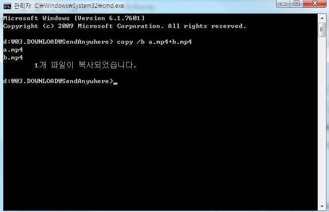 cmd 창에 copy /b a.mp4+b.mp4