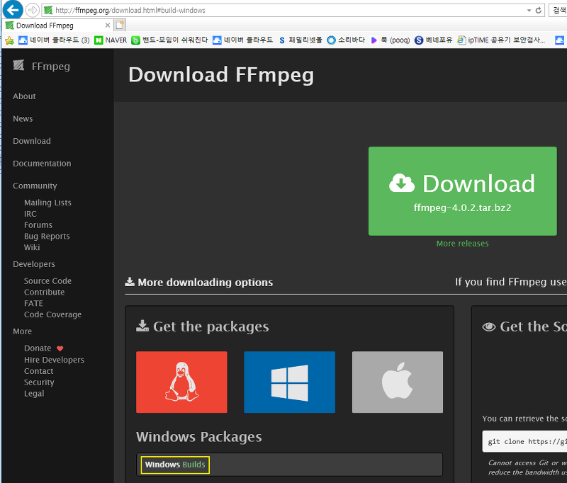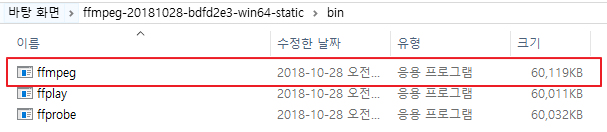 4. FFmpeg (링크, Get the packages 항목에서 받을 수 있다. 여기서 실제로 필요한 파일은 ffmpeg.exe)