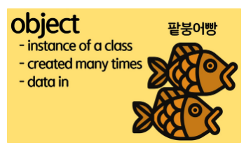 - object: instance of a class (class의 인스턴스)