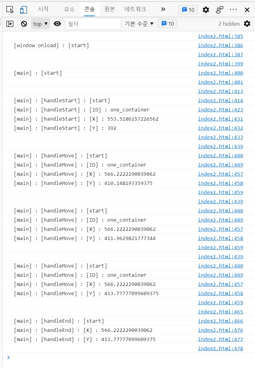 (javascript/자바스크립트) 터치 이벤트 등록 및 좌표 확인 실시 - touchstart , touchmove , touchend